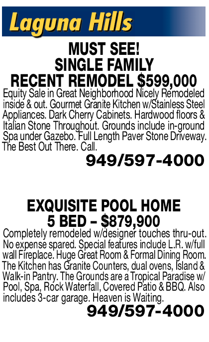 Laguna Hills MUST SEE! SINGLE FAMILY RECENT REMODEL $599,000 Equity Sale in Great Neighborhood Nicely Remodeled inside & out. Gourmet Granite Kitchen w/Stainless Steel Appliances. Dark Cherry Cabinets. Hardwood floors & Italian Stone Throughout. Grounds include in-ground Spa under Gazebo. Full Length Paver Stone Driveway. The Best Out There. Call. 949/597-4000 EXQUISITE POOL HOME 5 BED – $879,900 Completely remodeled w/designer touches thru-out. No expense spared. Special features include L.R. w/full wall Fireplace. Huge Great Room & Formal Dining Room. The Kitchen has Granite Counters, dual ovens, Island & Walk-in Pantry. The Grounds are a Tropical Paradise w/ Pool, Spa, Rock Waterfall, Covered Patio & BBQ. Also includes 3-car garage. Heaven is Waiting. 949/597-4000