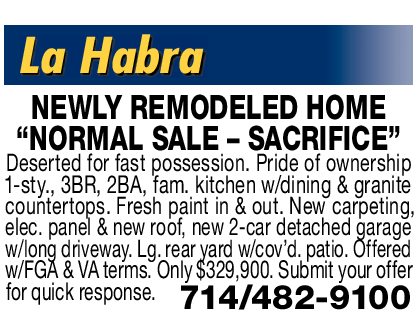 La Habra NEWLY REMODELED HOME “NORMAL SALE – SACRIFICE” Deserted for fast possession. Pride of ownership 1-sty., 3BR, 2BA, fam. kitchen w/dining & granite countertops. Fresh paint in & out. New carpeting, elec. panel & new roof, new 2-car detached garage w/long driveway. Lg. rear yard w/cov’d. patio. Offered w/FGA & VA terms. Only $329,900. Submit your offer for quick response. 714/482-9100