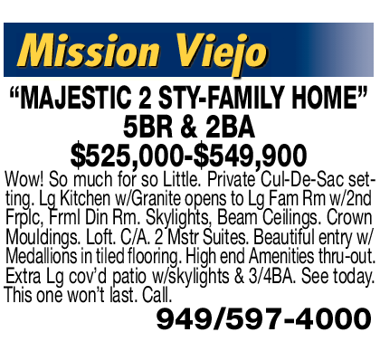 Mission Viejo “MAJESTIC 2 STY-FAMILY HOME” 5BR & 2BA $525,000-$549,900 Wow! So much for so Little. Private Cul-De-Sac setting. Lg Kitchen w/Granite opens to Lg Fam Rm w/2nd Frplc, Frml Din Rm. Skylights, Beam Ceilings. Crown Mouldings. Loft. C/A. 2 Mstr Suites. Beautiful entry w/ Medallions in tiled flooring. High end Amenities thru-out. Extra Lg cov’d patio w/skylights & 3/4BA. See today. This one won’t last. Call. 949/597-4000