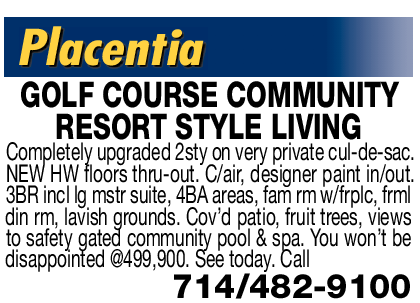 Placentia GOLF COURSE COMMUNITY RESORT STYLE LIVING Completely upgraded 2sty on very private cul-de-sac. NEW HW floors thru-out. C/air, designer paint in/out. 3BR incl lg mstr suite, 4BA areas, fam rm w/frplc, frml din rm, lavish grounds. Cov’d patio, fruit trees, views to safety gated community pool & spa. You won’t be disappointed @499,900. See today. Call 714/482-9100