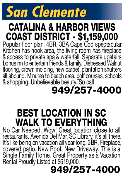 CATALINA & HARBOR VIEWS COAST DISTRICT - $1,159,000 Popular floor plan. 4BR, 3BA Cape Cod spectacular. Kitchen has nook area, the living room has fireplace & access to private spa & waterfall. Separate upstairs bonus rm to entertain friends & family. Distressed Walnut flooring, crown molding, new carpet, plantation shutters all abound. Minutes to beach area, golf courses, schools & shopping. Unbelievable beauty. So call 949/257-4000