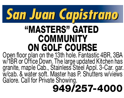 San Juan Capistrano “MASTERS” GATED COMMUNITY ON GOLF COURSE Open floor plan on the 13th hole. Fantastic 4BR, 3BA w/1BR or Office Down. The large updated Kitchen has granite, maple Cab., Stainless Steel Appl. 3-Car. gar. w/cab. & water soft. Master has P. Shutters w/views Galore. Call for Private Showing. 949/257-4000