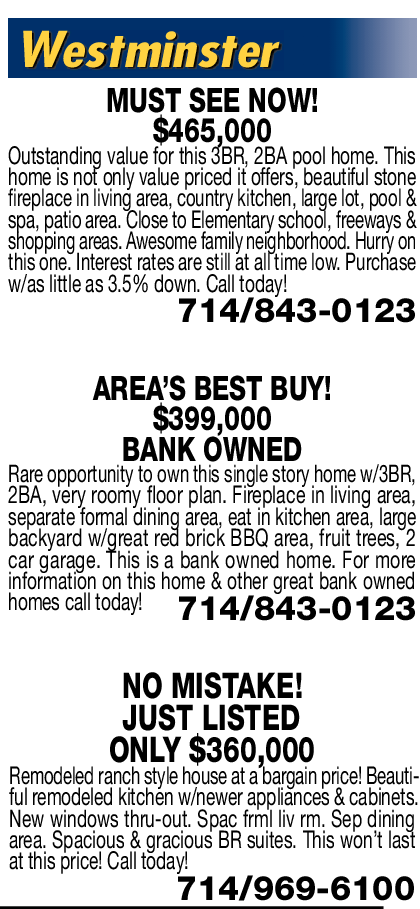 $399,000 BANK OWNED Rare opportunity to own this single story home w/3BR, 2BA, very roomy floor plan. Fireplace in living area, separate formal dining area, eat in kitchen area, large backyard w/great red brick BBQ area, fruit trees, 2 car garage. This is a bank owned home. For more information on this home & other great bank owned homes call today! 714/843-0123