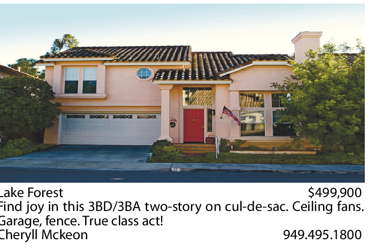 Lake Forest $499,900 Find joy in this 3BD/3BA two-story on cul-de-sac. Ceiling fans. Garage, fence. True class act! Cheryll Mckeon 949.495.1800