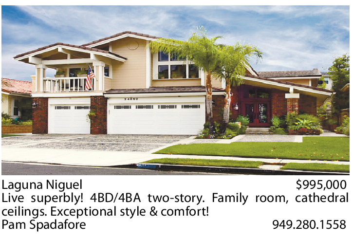 Laguna Niguel $995,000 Live superbly! 4BD/4BA two-story. Family room, cathedral ceilings. Exceptional style & comfort! Pam Spadafore 949.280.1558