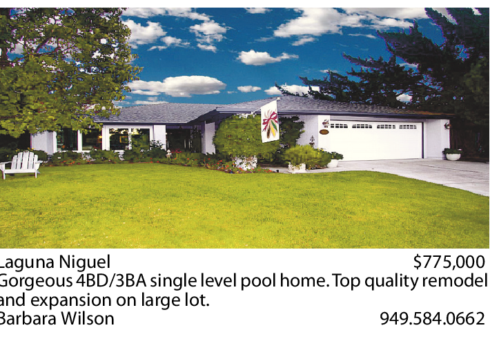 Laguna Niguel $775,000 Gorgeous 4BD/3BA single level pool home. Top quality remodel and expansion on large lot. Barbara Wilson 949.584.0662