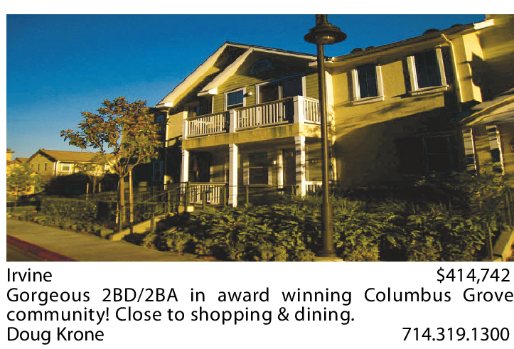 Irvine $414,742 Gorgeous 2BD/2BA in award winning Columbus Grove community! Close to shopping & dining. Doug Krone 714.319.1300