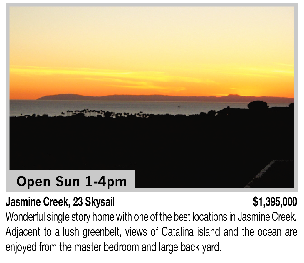 Jasmine Creek, 23 Skysail $1,395,000 Wonderful single story home with one of the best locations in Jasmine Creek. Adjacent to a lush greenbelt, views of Catalina island and the ocean are enjoyed from the master bedroom and large back yard.