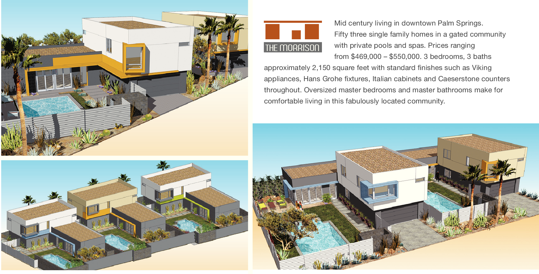 Mid century living in downtown Palm Springs. Fifty three single family homes in a gated community with private pools and spas. Prices ranging from $469,000 – $550,000. 3 bedrooms, 3 baths approximately 2,150 square feet with standard finishes such as Viking appliances, Hans Grohe fixtures, Italian cabinets and Caeserstone counters throughout. Oversized master bedrooms and master bathrooms make for comfortable living in this fabulously located community.