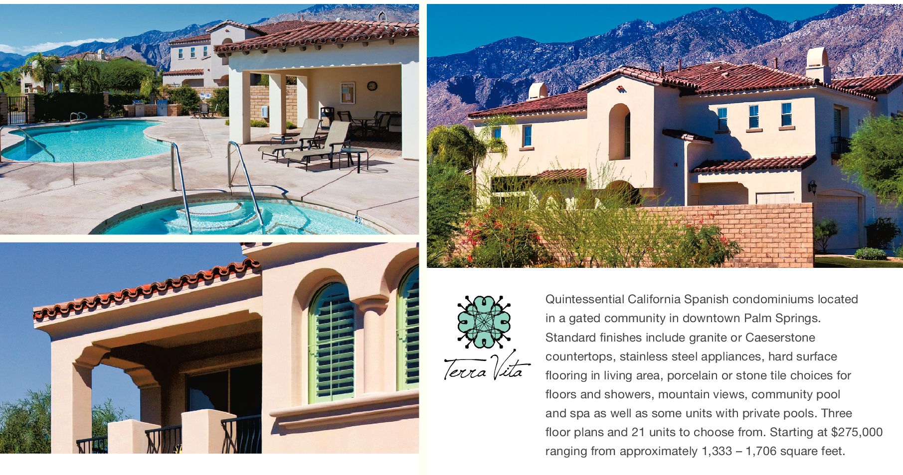 Quintessential California Spanish condominiums located in a gated community in downtown Palm Springs. Standard finishes include granite or Caeserstone countertops, stainless steel appliances, hard surface flooring in living area, porcelain or stone tile choices for floors and showers, mountain views, community pool and spa as well as some units with private pools. Three floor plans and 21 units to choose from. Starting at $275,000 ranging from approximately 1,333 – 1,706 square feet.