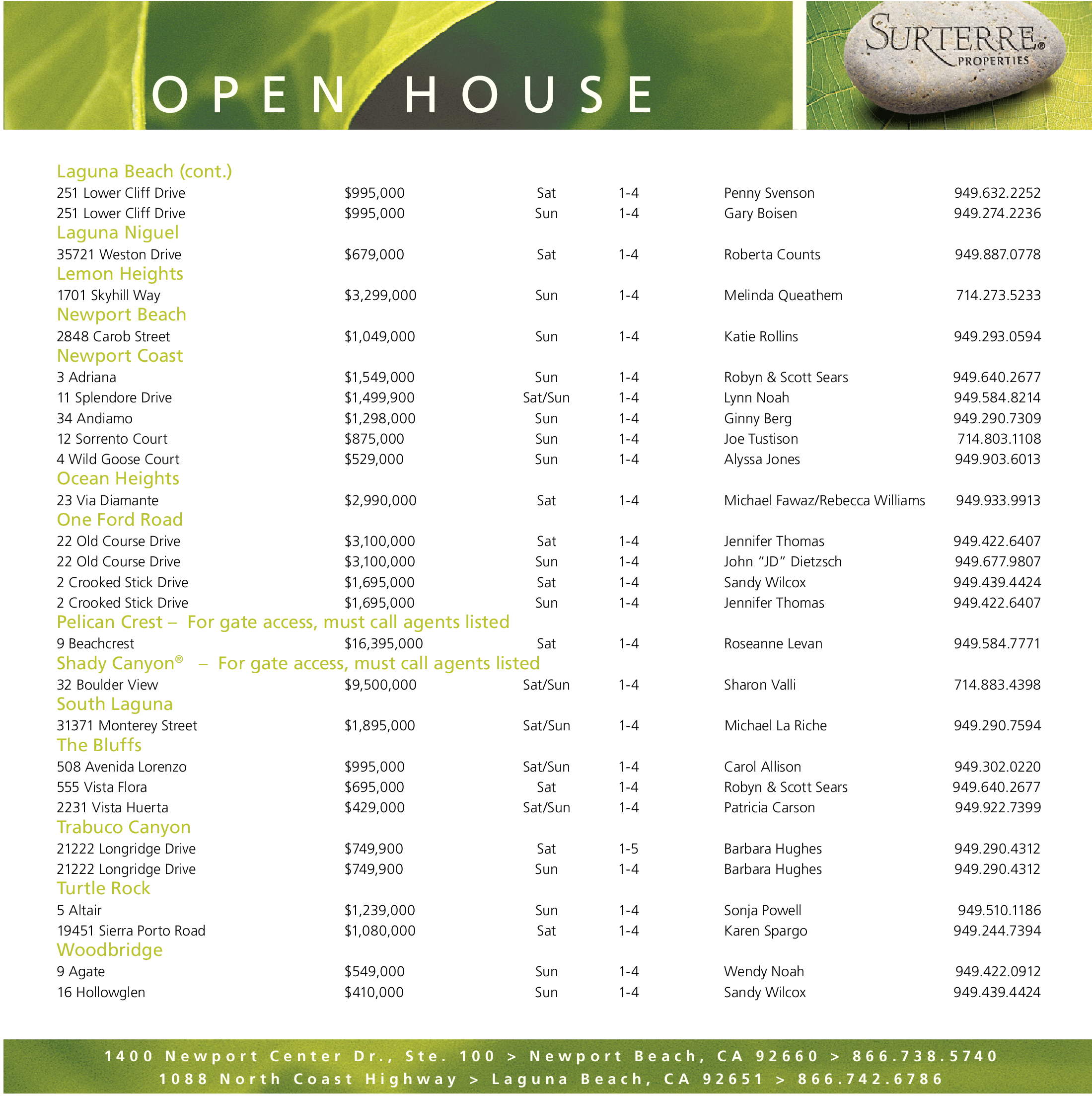 Laguna Beach (cont.) 251 Lower Cliff Drive $995,000 Sat 1-4 Penny Svenson 949.632.2252 251 Lower Cliff Drive $995,000 Sun 1-4 Gary Boisen 949.274.2236 Laguna Niguel 35721 Weston Drive $679,000 Sat 1-4 Roberta Counts 949.887.0778 Lemon Heights 1701 Skyhill Way $3,299,000 Sun 1-4 Melinda Queathem 714.273.5233 Newport Beach 2848 Carob Street $1,049,000 Sun 1-4 Katie Rollins 949.293.0594 Newport Coast 3 Adriana $1,549,000 Sun 1-4 Robyn & Scott Sears 949.640.2677 11 Splendore Drive $1,499,900 Sat/Sun 1-4 Lynn Noah 949.584.8214 34 Andiamo $1,298,000 Sun 1-4 Ginny Berg 949.290.7309 12 Sorrento Court $875,000 Sun 1-4 Joe Tustison 714.803.1108 4 Wild Goose Court $529,000 Sun 1-4 Alyssa Jones 949.903.6013 Ocean Heights 23 Via Diamante $2,990,000 Sat 1-4 Michael Fawaz/Rebecca Williams 949.933.9913 One Ford Road 22 Old Course Drive $3,100,000 Sat 1-4 Jennifer Thomas 949.422.6407 22 Old Course Drive $3,100,000 Sun 1-4 John “JD” Dietzsch 949.677.9807 2 Crooked Stick Drive $1,695,000 Sat 1-4 Sandy Wilcox 949.439.4424 2 Crooked Stick Drive $1,695,000 Sun 1-4 Jennifer Thomas 949.422.6407 Pelican Crest – For gate access, must call agents listed 9 Beachcrest $16,395,000 Sat 1-4 Roseanne Levan 949.584.7771 Shady Canyon ® – For gate access, must call agents listed 32 Boulder View $9,500,000 Sat/Sun 1-4 Sharon Valli 714.883.4398 South Laguna 31371 Monterey Street $1,895,000 Sat/Sun 1-4 Michael La Riche 949.290.7594 The Bluffs 508 Avenida Lorenzo $995,000 Sat/Sun 1-4 Carol Allison 949.302.0220 555 Vista Flora $695,000 Sat 1-4 Robyn & Scott Sears 949.640.2677 2231 Vista Huerta $429,000 Sat/Sun 1-4 Patricia Carson 949.922.7399 Trabuco Canyon 21222 Longridge Drive $749,900 Sat 1-5 Barbara Hughes 949.290.4312 21222 Longridge Drive $749,900 Sun 1-4 Barbara Hughes 949.290.4312 Turtle Rock 5 Altair $1,239,000 Sun 1-4 Sonja Powell 949.510.1186 19451 Sierra Porto Road $1,080,000 Sat 1-4 Karen Spargo 949.244.7394 Woodbridge 9 Agate $549,000 Sun 1-4 Wendy Noah 949.422.0912 16 Hollowglen $410,000 Sun 1-4 Sandy Wilcox 949.439.4424