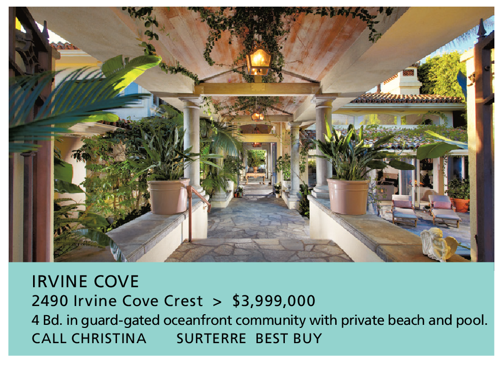 IRVINE COVE 2490 Irvine Cove Crest > $3,999,000 4 Bd. in guard-gated oceanfront community with private beach and pool. CALL CHRISTINA SURTERRE BEST BUY