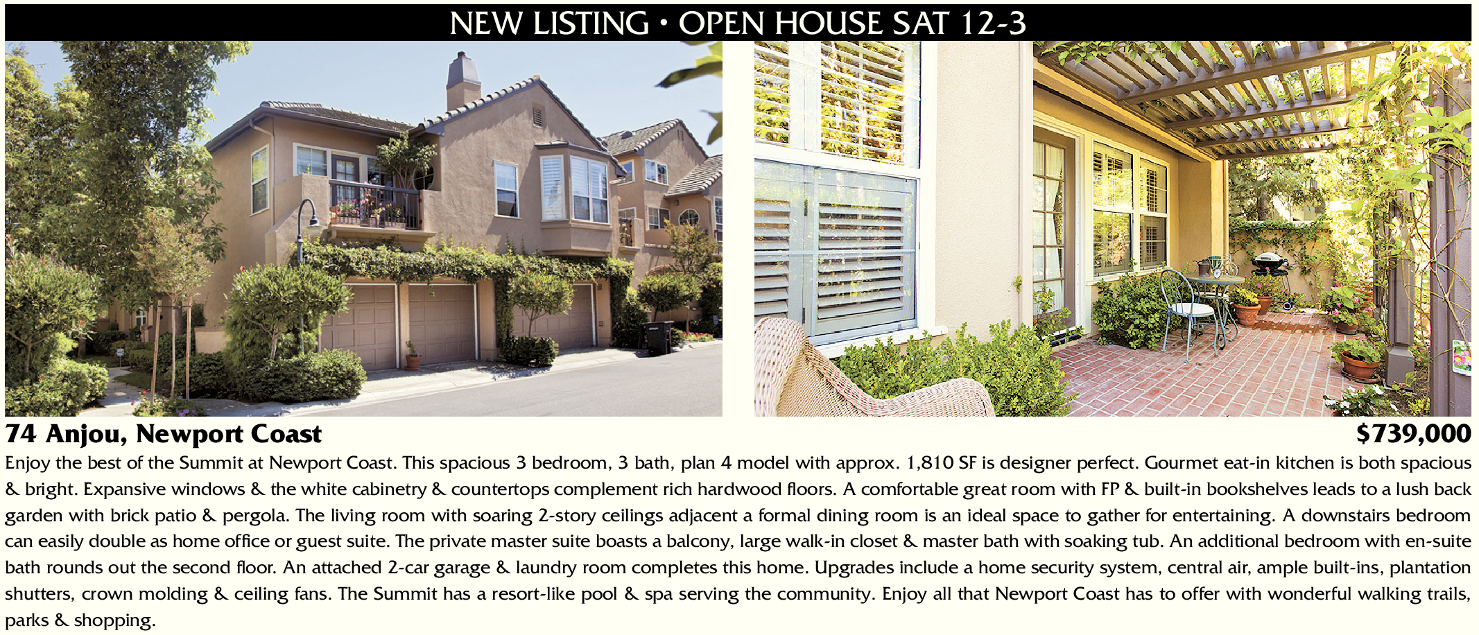NEW LISTING • OPEN HOUSE SAT 12-3 74 Anjou, Newport Coast $739,000 Enjoy the best of the Summit at Newport Coast. This spacious 3 bedroom, 3 bath, plan 4 model with approx. 1,810 SF is designer perfect. Gourmet eat-in kitchen is both spacious & bright. Expansive windows & the white cabinetry & countertops complement rich hardwood floors. A comfortable great room with FP & built-in bookshelves leads to a lush back garden with brick patio & pergola. The living room with soaring 2-story ceilings adjacent a formal dining room is an ideal space to gather for entertaining. A downstairs bedroom can easily double as home office or guest suite. The private master suite boasts a balcony, large walk-in closet & master bath with soaking tub. An additional bedroom with en-suite bath rounds out the second floor. An attached 2-car garage & laundry room completes this home. Upgrades include a home security system, central air, ample built-ins, plantation shutters, crown molding & ceiling fans. The Summit has a resort-like pool & spa serving the community. Enjoy all that Newport Coast has to offer with wonderful walking trails, parks & shopping.