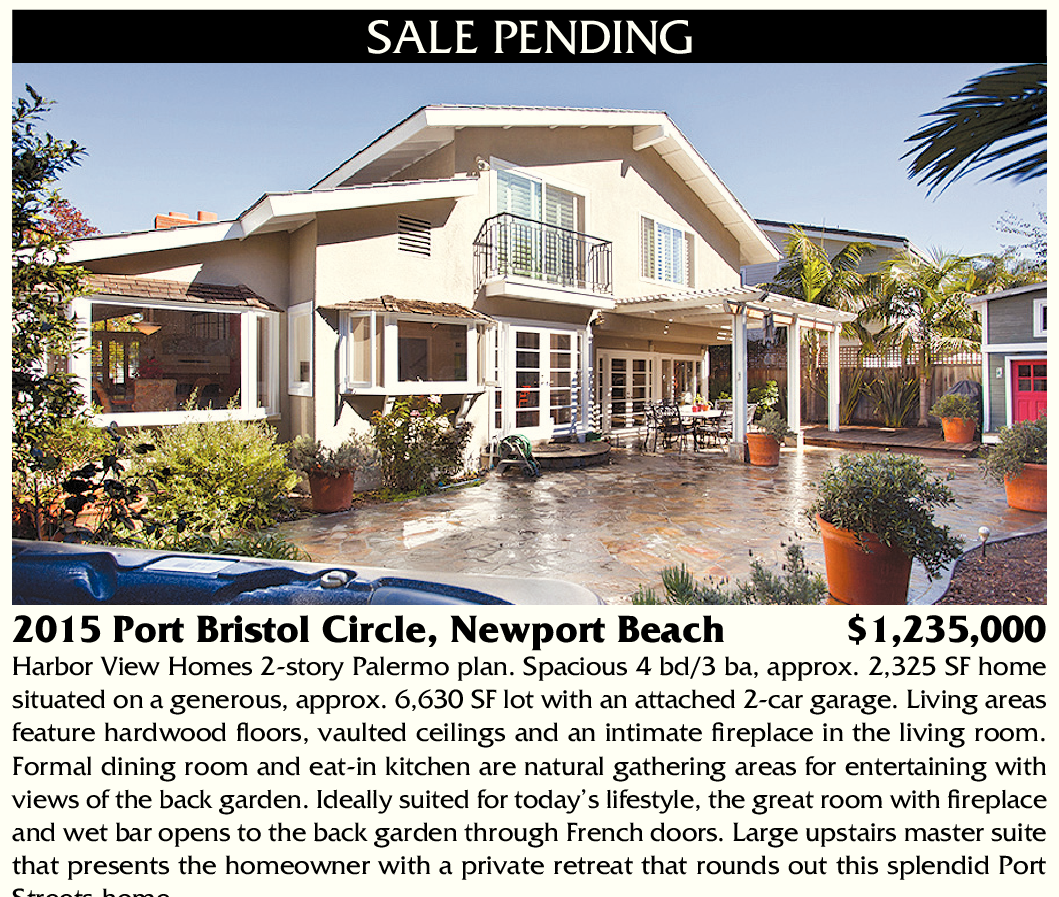 2015 Port Bristol Circle, Newport Beach $1,235,000 Harbor View Homes 2-story Palermo plan. Spacious 4 bd/3 ba, approx. 2,325 SF home situated on a generous, approx. 6,630 SF lot with an attached 2-car garage. Living areas feature hardwood floors, vaulted ceilings and an intimate fireplace in the living room. Formal dining room and eat-in kitchen are natural gathering areas for entertaining with views of the back garden. Ideally suited for today’s lifestyle, the great room with fireplace and wet bar opens to the back garden through French doors. Large upstairs master suite that presents the homeowner with a private retreat that rounds out this splendid Port Streets home. SALE PENDING