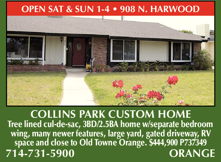 COLLINS PARK CUSTOM HOME Tree lined cul-de-sac, 3BD/2.5BA home w/separate bedroom wing, many newer features, large yard, gated driveway, RV space and close to Old Towne Orange. $444,900 P737349 714-731-5900 ORANGE