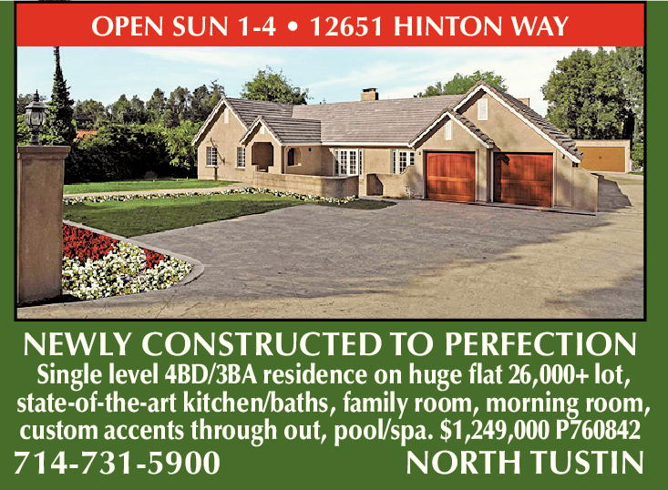 NEWLY CONSTRUCTED TO PERFECTION Single level 4BD/3BA residence on huge flat 26,000+ lot, state-of-the-art kitchen/baths, family room, morning room, custom accents through out, pool/spa. $1,249,000 P760842 714-731-5900 NORTH TUSTIN