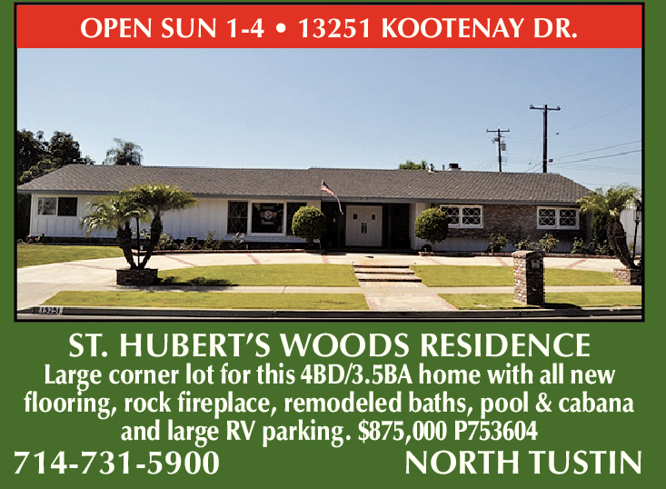 OPEN OPEN SUN SUN 1-4 1-4 • 6416 • 13251 E. KINGS KOOTENAY CROWN DR. RD. ST. HUBERT’S WOODS RESIDENCE Large corner lot for this 4BD/3.5BA home with all new flooring, rock fireplace, remodeled baths, pool & cabana and large RV parking. $875,000 P753604 714-731-5900 NORTH TUSTIN
