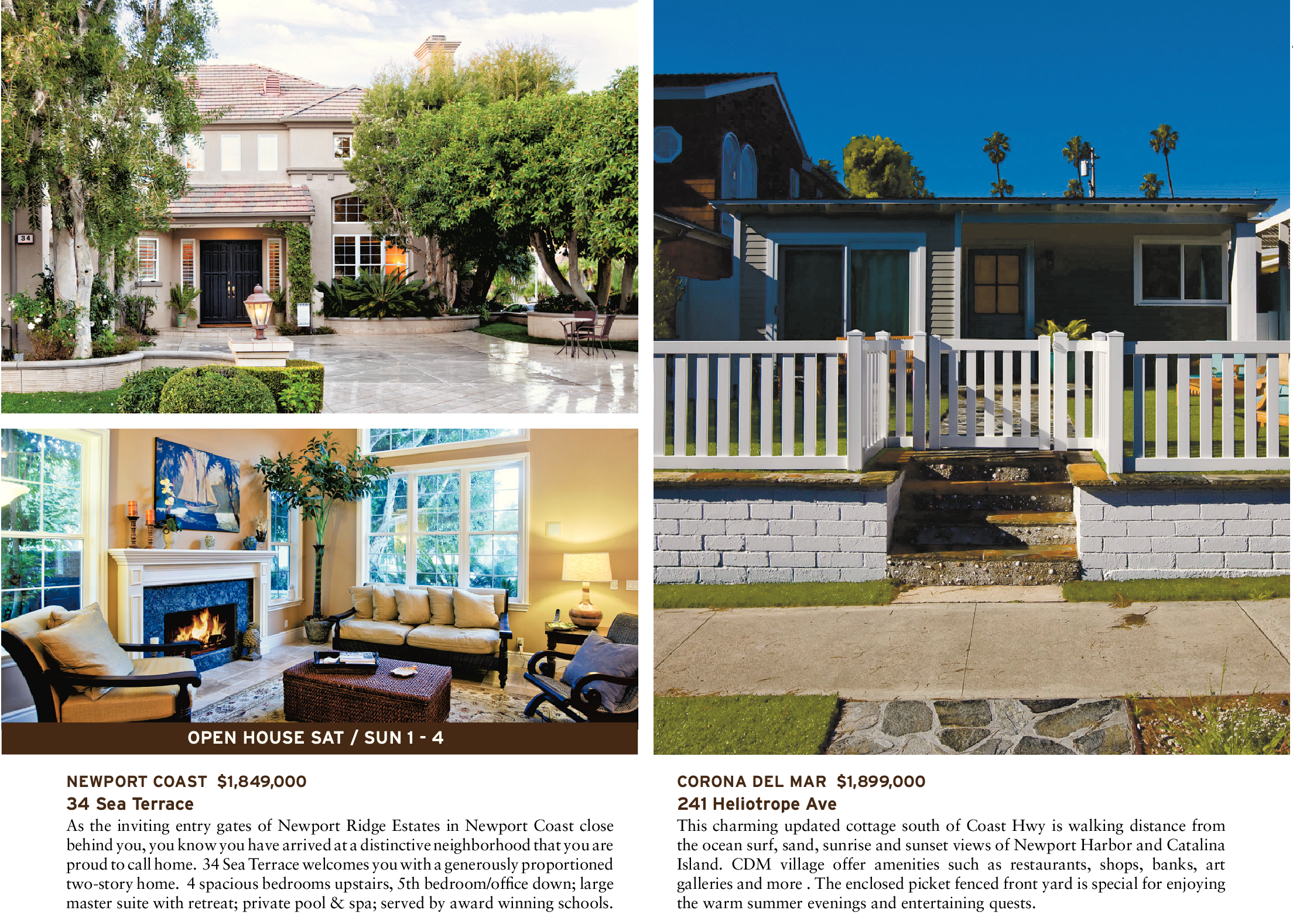 OPEN HOUSE SAT / SUN 1 - 4 NEWPORT COAST $1,849,000 34 Sea Terrace As the inviting entry gates of Newport Ridge Estates in Newport Coast close behind you, you know you have arrived at a distinctive neighborhood that you are proud to call home. 34 Sea Terrace welcomes you with a generously proportioned two-story home. 4 spacious bedrooms upstairs, 5th bedroom/office down; large master suite with retreat; private pool & spa; served by award winning schools. CORONA DEL MAR $1,899,000 241 Heliotrope Ave This charming updated cottage south of Coast Hwy is walking distance from the ocean surf, sand, sunrise and sunset views of Newport Harbor and Catalina Island. CDM village offer amenities such as restaurants, shops, banks, art galleries and more . The enclosed picket fenced front yard is special for enjoying the warm summer evenings and entertaining quests.