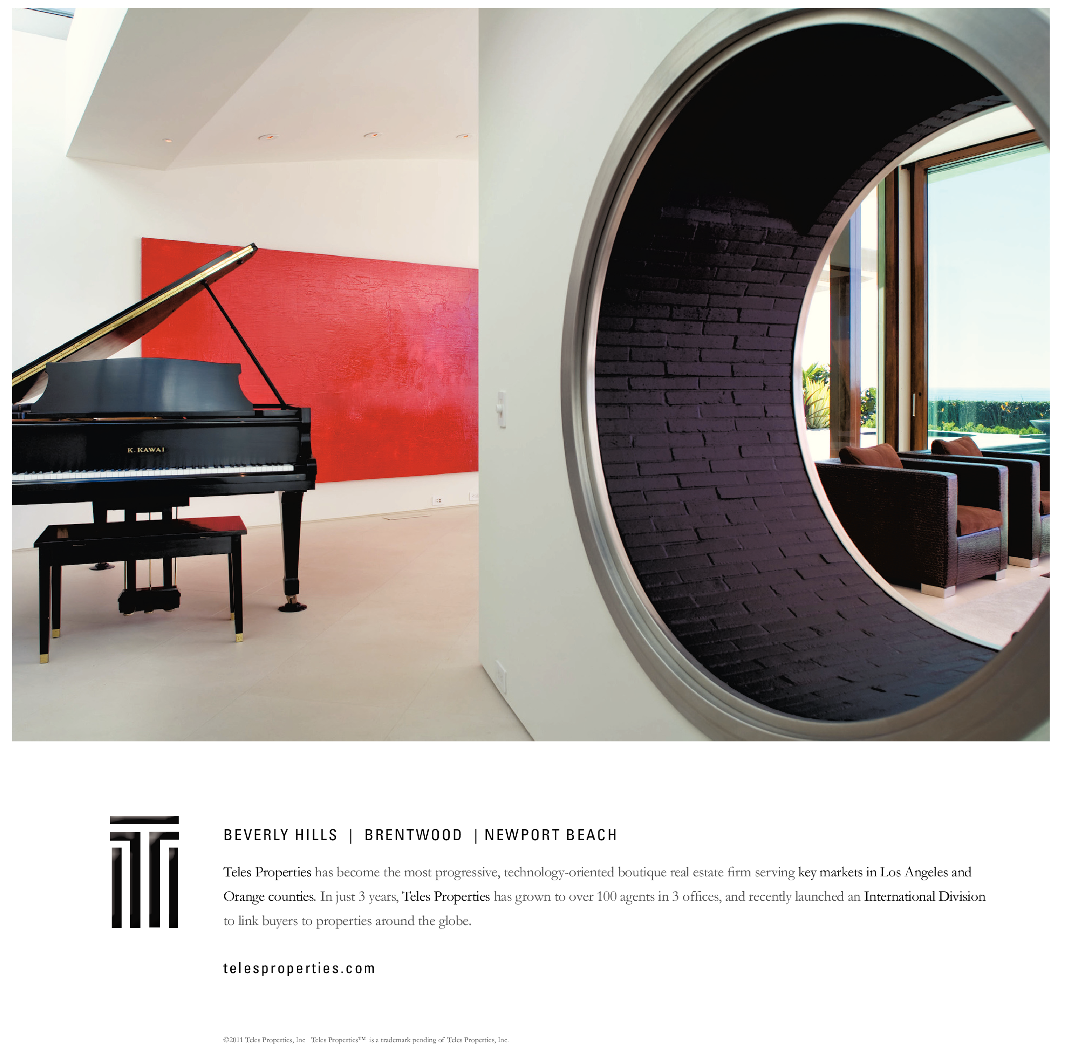BEVERLY HILLS | BRENTWOOD | NEWPORT BEACH Teles Properties has become the most progressive, technology-oriented boutique real estate firm serving key markets in Los Angeles and Orange counties. In just 3 years, Teles Properties has grown to over 100 agents in 3 offices, and recently launched an International Division to link buyers to properties around the globe. telesproperties.com ©2011 Teles Properties, Inc Teles Properties™ is a trademark pending of Teles Properties, Inc.