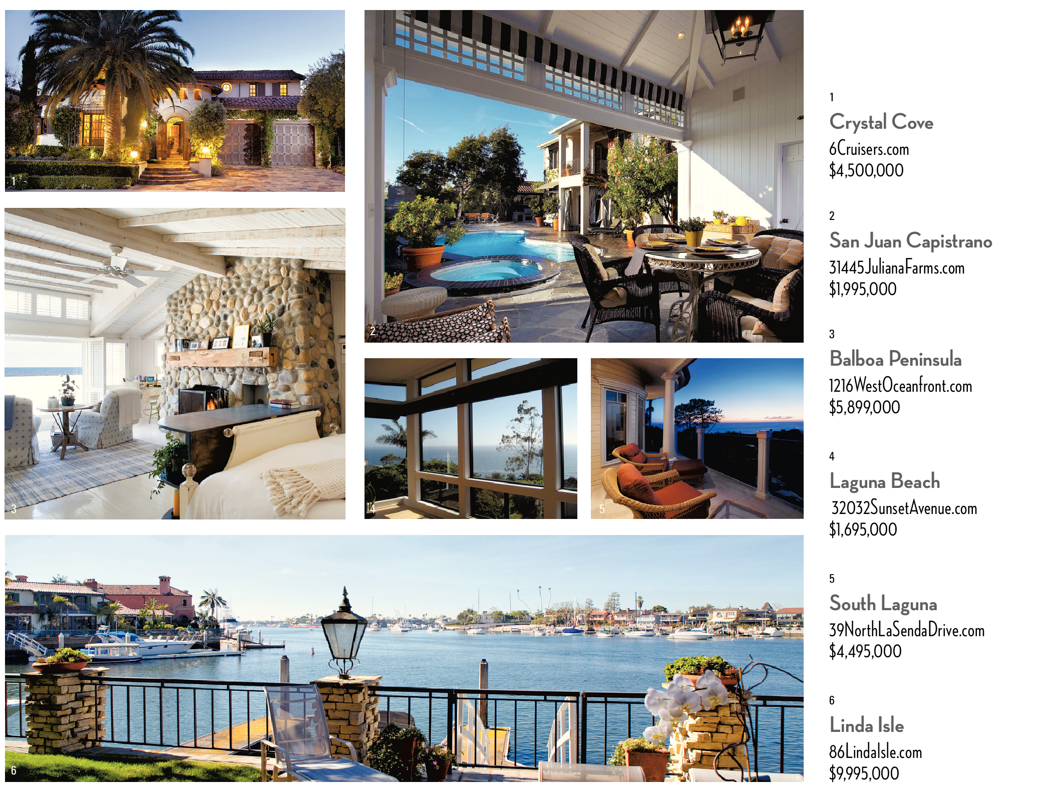 1 3 4 5 6 2 1 Crystal Cove 6Cruisers.com $4,500,000 2 San Juan Capistrano 31445JulianaFarms.com $1,995,000 3 Balboa Peninsula 1216WestOceanfront.com $5,899,000 4 Laguna Beach 32032SunsetAvenue.com $1,695,000 5 South Laguna 39NorthLaSendaDrive.com $4,495,000 6 Linda Isle 86LindaIsle.com $9,995,000