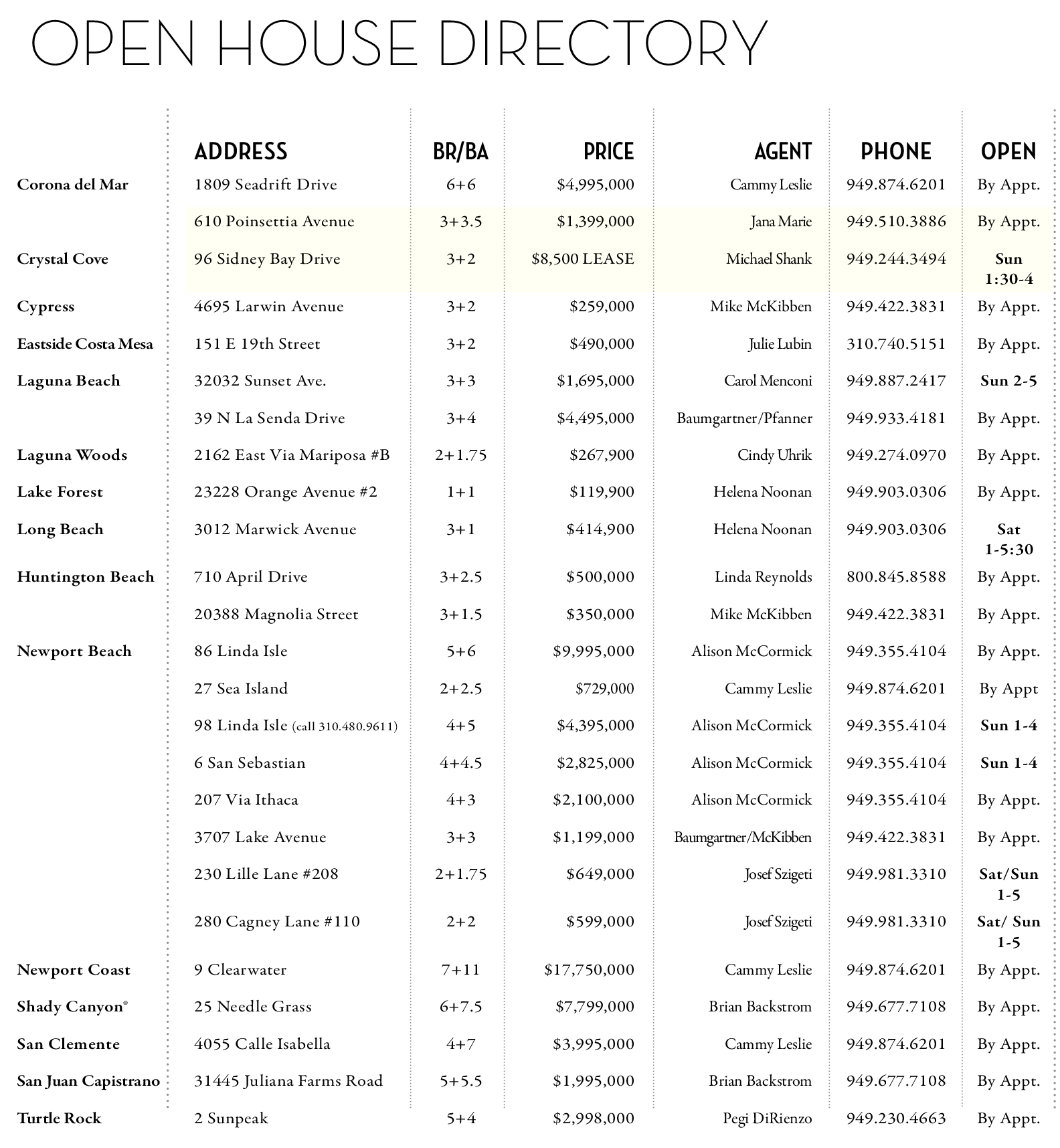 Crystal Cove 96 Sidney Bay Drive 3+2 $8,500 LEASE Michael Shank 949.244.3494 Sun 1:30-4 Cypress 4695 Larwin Avenue 3+2 $259,000 Mike McKibben 949.422.3831 By Appt.