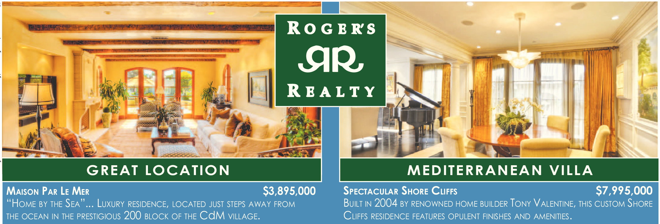 38 GREAT LOCATION MAISON PAR LE MER $3,895,000 “HOME BY THE SEA”... LUXURY RESIDENCE, LOCATED JUST STEPS AWAY FROM THE OCEAN IN THE PRESTIGIOUS 200 BLOCK OF THE CdM VILLAGE. MEDITERRANEAN VILLA SPECTACULAR SHORE CLIFFS $7,995,000 BUILT IN 2004 BY RENOWNED HOME BUILDER TONY VALENTINE, THIS CUSTOM SHORE CLIFFS RESIDENCE FEATURES OPULENT FINISHES AND AMENITIES.