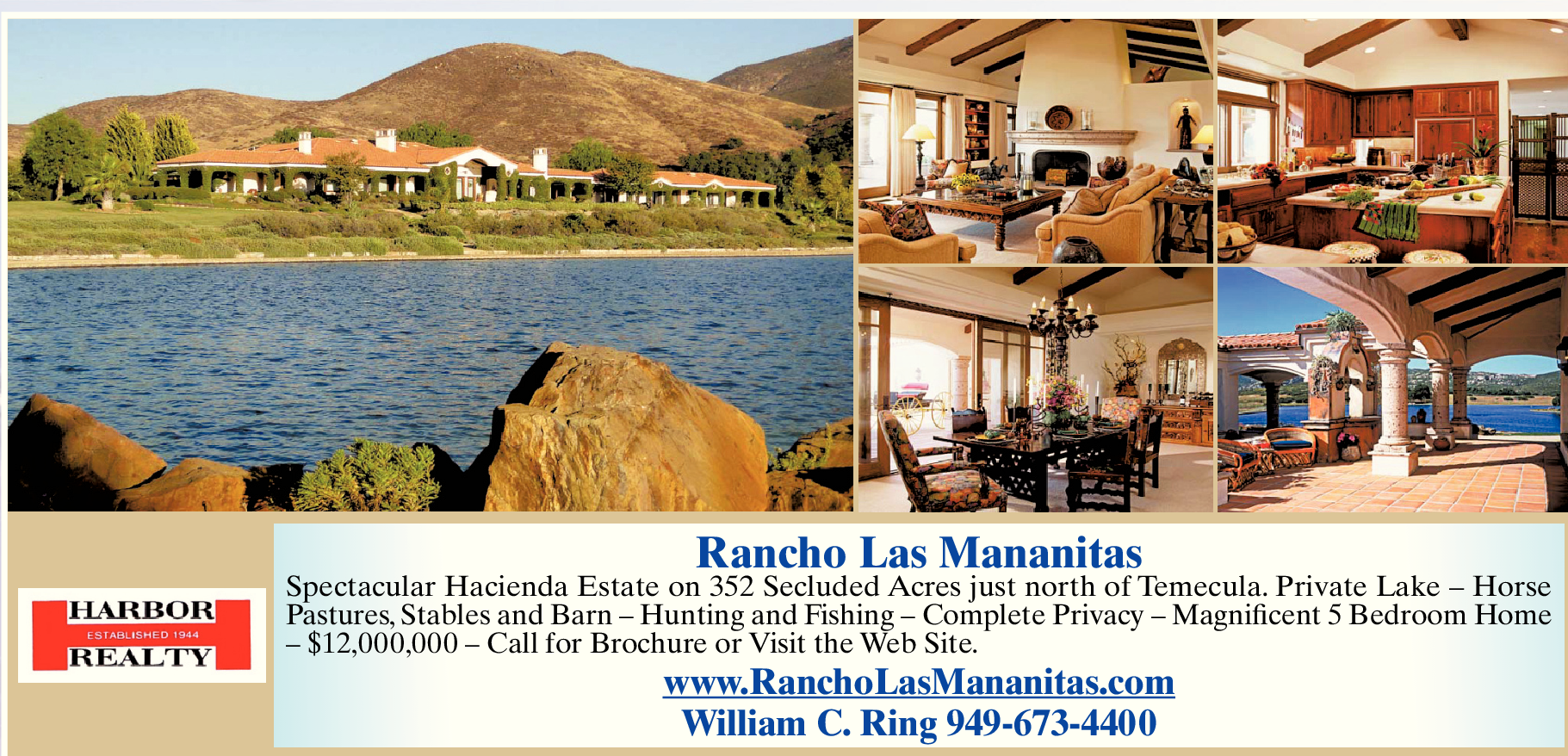 Rancho Las Mananitas Spectacular Hacienda Estate on 352 Secluded Acres just north of Temecula. Private Lake – Horse Pastures, Stables and Barn – Hunting and Fishing – Complete Privacy – Magnificent 5 Bedroom Home – $12,000,000 – Call for Brochure or Visit the Web Site. www.RanchoLasMananitas.com William C. Ring 949-673-4400