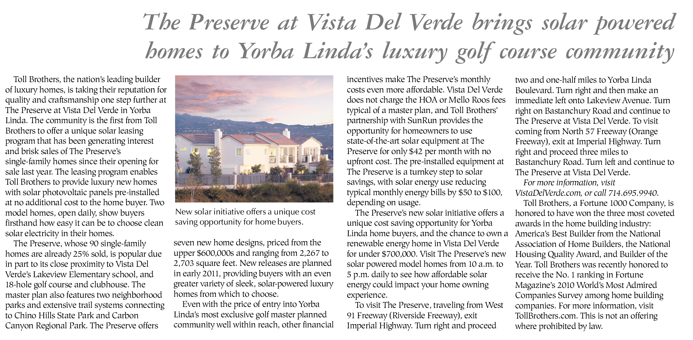 Toll Brothers, the nation’s leading builder of luxury homes, is taking their reputation for quality and craftsmanship one step further at The Preserve at Vista Del Verde in Yorba Linda. The community is the first from Toll Brothers to offer a unique solar leasing program that has been generating interest and brisk sales of The Preserve’s single-family homes since their opening for sale last year. The leasing program enables Toll Brothers to provide luxury new homes with solar photovoltaic panels pre-installed at no additional cost to the home buyer. Two model homes, open daily, show buyers firsthand how easy it can be to choose clean solar electricity in their homes.