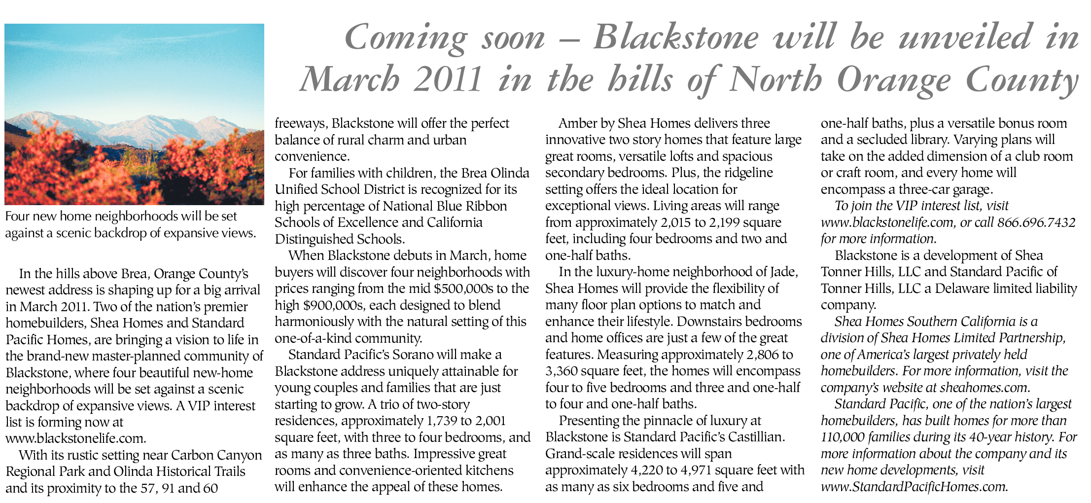 In the hills above Brea, Orange County’s newest address is shaping up for a big arrival in March 2011. Two of the nation’s premier homebuilders, Shea Homes and Standard Pacific Homes, are bringing a vision to life in the brand-new master-planned community of Blackstone, where four beautiful new-home neighborhoods will be set against a scenic backdrop of expansive views. A VIP interest list is forming now at www.blackstonelife.com.