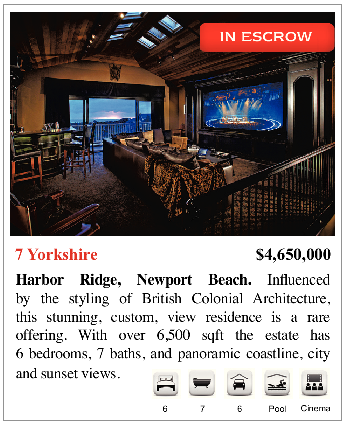 IN ESCROW 7 Yorkshire $4,650,000 Harbor Ridge, Newport Beach. Influenced by the styling of British Colonial Architecture, this stunning, custom, view residence is a rare offering. With over 6,500 sqft the estate has 6 bedrooms, 7 baths, and panoramic coastline, city and sunset views. 6 7 6 Pool Cinema