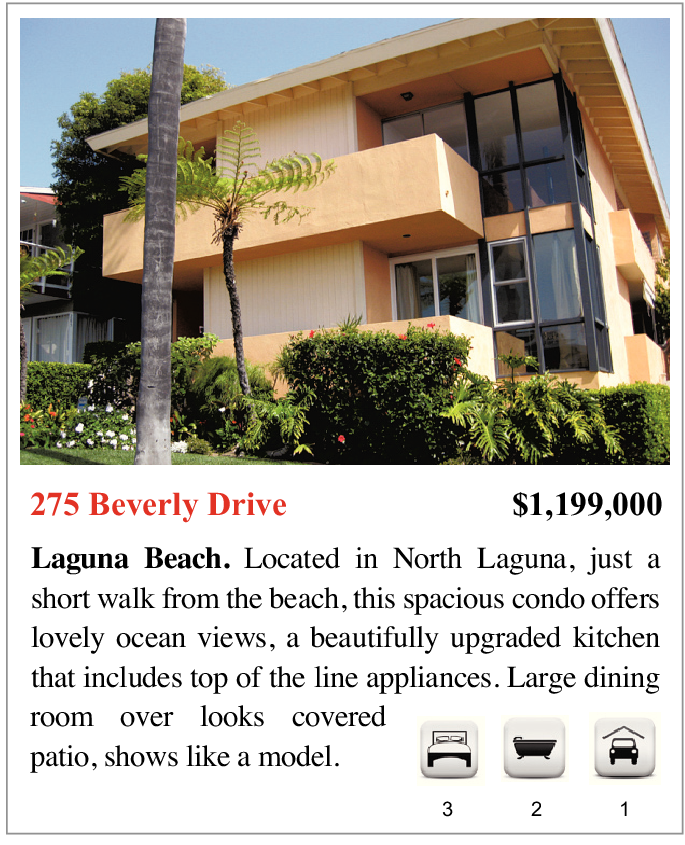 Laguna Beach. Located in North Laguna, just a short walk from the beach, this spacious condo offers lovely ocean views, a beautifully upgraded kitchen that includes top of the line appliances. Large dining room over looks covered patio, shows like a model.
