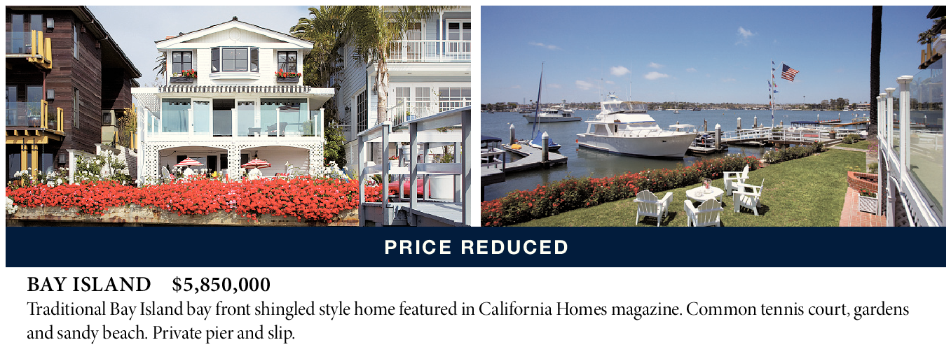 BAY ISLAND $5,850,000 Traditional Bay Island bay front shingled style home featured in California Homes magazine. Common tennis court, gardens and sandy beach. Private pier and slip.