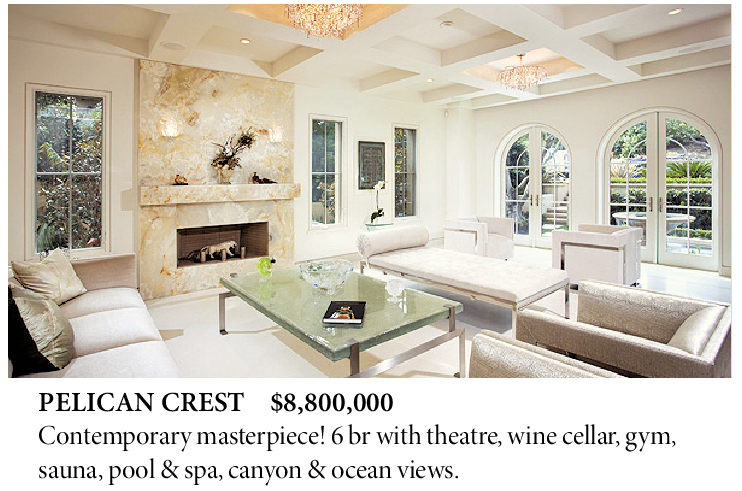 PELICAN CREST $8,800,000 Contemporary masterpiece! 6 br with theatre, wine cellar, gym, sauna, pool & spa, canyon & ocean views.