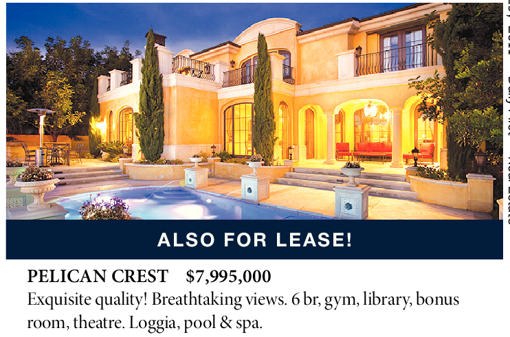 PELICAN CREST $7,995,000 Exquisite quality! Breathtaking views. 6 br, gym, library, bonus room, theatre. Loggia, pool & spa.