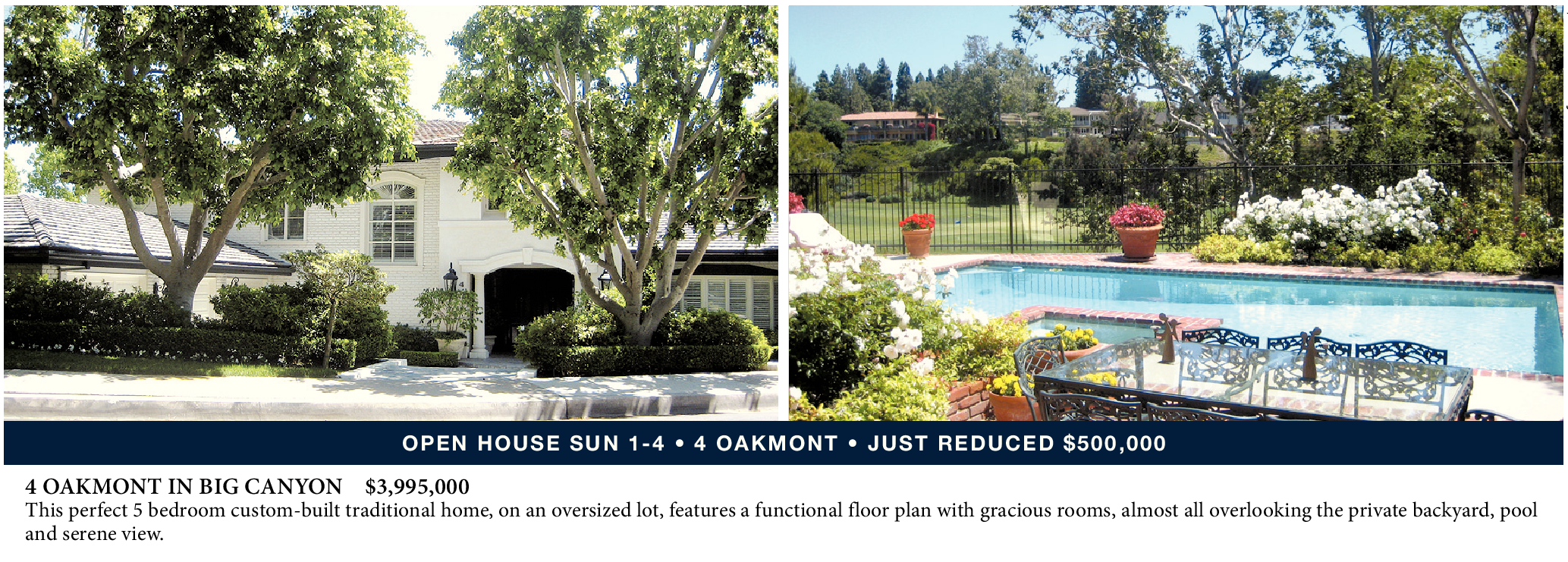 4 OAKMONT IN BIG CANYON $3,995,000 This perfect 5 bedroom custom-built traditional home, on an oversized lot, features a functional floor plan with gracious rooms, almost all overlooking the private backyard, pool and serene view. OPEN HOUSE SUN 1-4 • 4 OAKMONT • JUST REDUCED $500,000