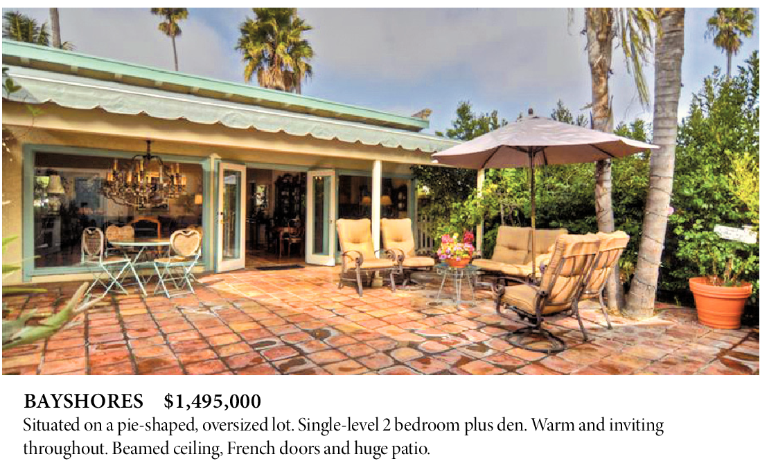 BAYSHORES $1,495,000 Situated on a pie-shaped, oversized lot. Single-level 2 bedroom plus den. Warm and inviting throughout. Beamed ceiling, French doors and huge patio.