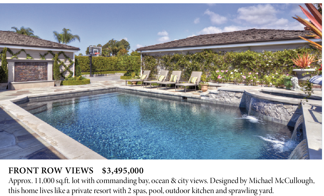 FRONT ROW VIEWS $3,495,000 Approx. 11,000 sq.ft. lot with commanding bay, ocean & city views. Designed by Michael McCullough, this home lives like a private resort with 2 spas, pool, outdoor kitchen and sprawling yard.