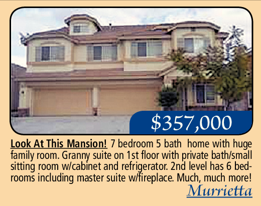 $357,000 Look At This Mansion! 7 bedroom 5 bath home with huge family room. Granny suite on 1st floor with private bath/small sitting room w/cabinet and refrigerator. 2nd level has 6 bedrooms including master suite w/fireplace. Much, much more! Murrietta