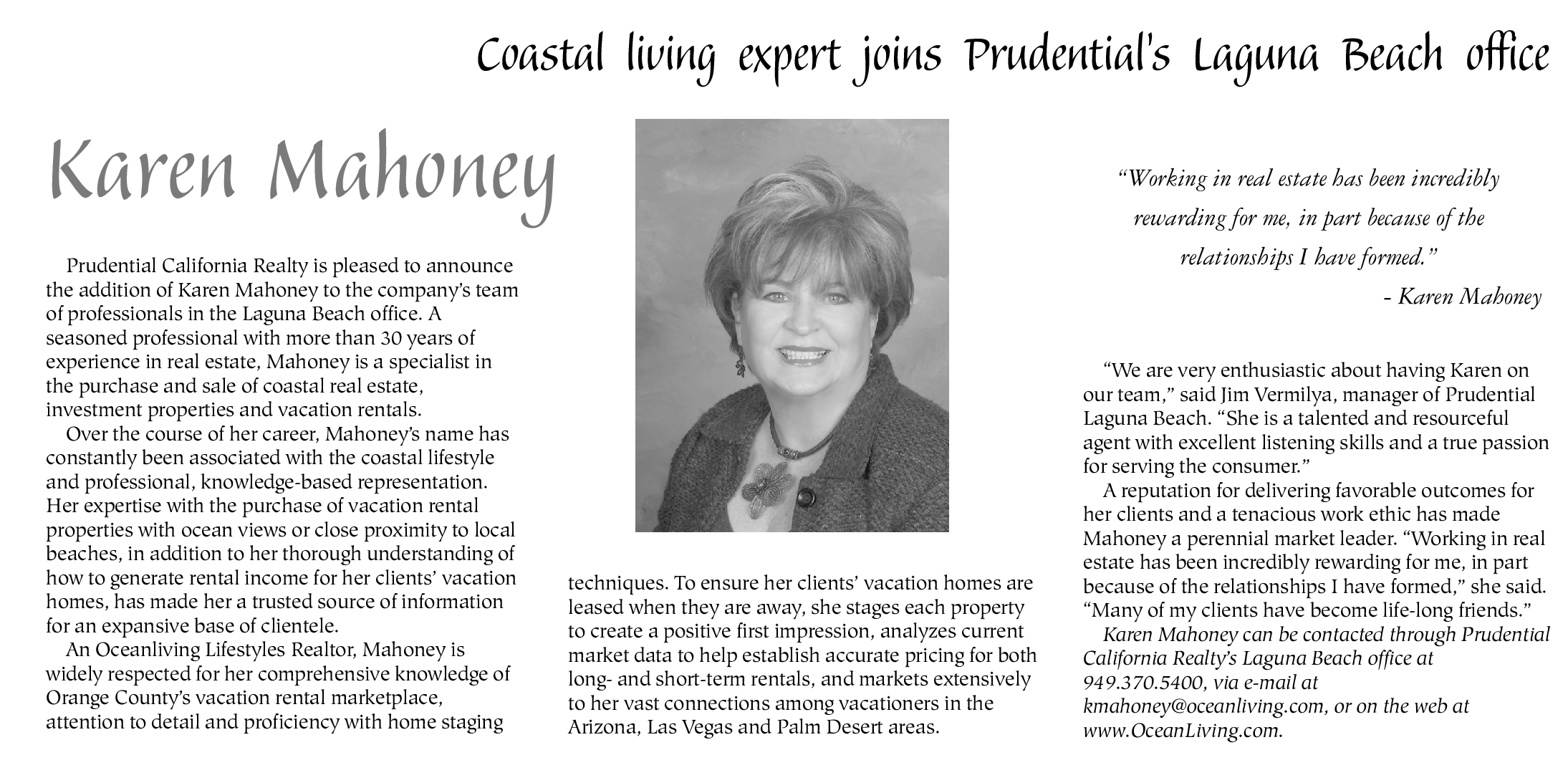 “We are very enthusiastic about having Karen on our team,” said Jim Vermilya, manager of Prudential Laguna Beach. “She is a talented and resourceful agent with excellent listening skills and a true passion for serving the consumer.”