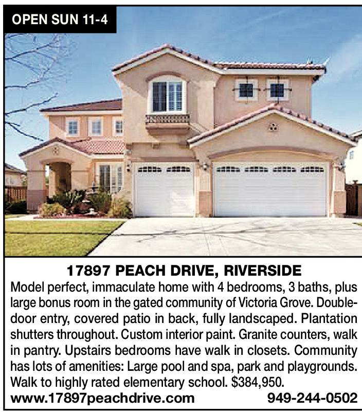 OPEN SUN 11-4 17897 PEACH DRIVE, RIVERSIDE Model perfect, immaculate home with 4 bedrooms, 3 baths, plus large bonus room in the gated community of Victoria Grove. Doubledoor entry, covered patio in back, fully landscaped. Plantation shutters throughout. Custom interior paint. Granite counters, walk in pantry. Upstairs bedrooms have walk in closets. Community has lots of amenities: Large pool and spa, park and playgrounds. Walk to highly rated elementary school. $384,950. www.17897peachdrive.com 949-244-0502