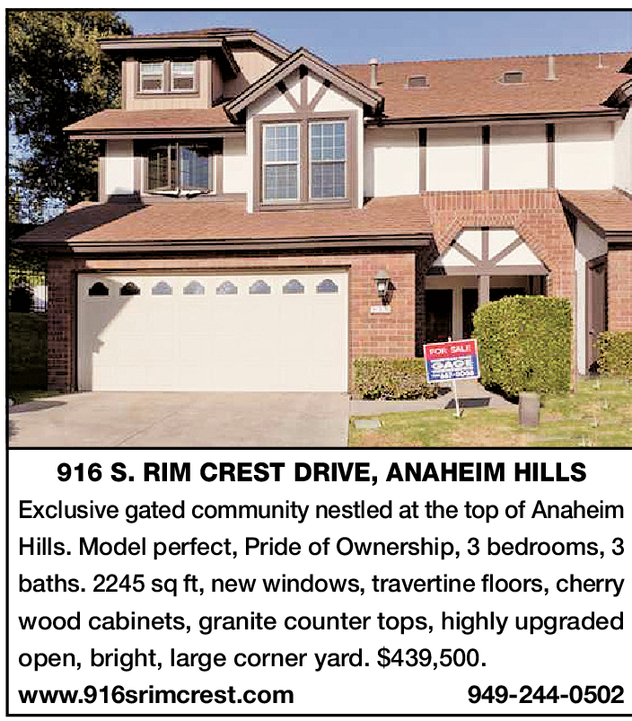 916 S. RIM CREST DRIVE, ANAHEIM HILLS Exclusive gated community nestled at the top of Anaheim Hills. Model perfect, Pride of Ownership, 3 bedrooms, 3 baths. 2245 sq ft, new windows, travertine floors, cherry wood cabinets, granite counter tops, highly upgraded open, bright, large corner yard. $439,500. www.916srimcrest.com 949-244-0502