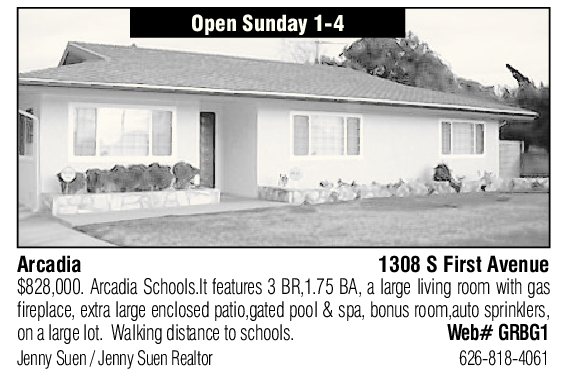 Open Sunday 1-4 Arcadia 1308 S First Avenue $828,000. Arcadia Schools.It features 3 BR,1.75 BA, a large living room with gas fireplace, extra large enclosed patio,gated pool & spa, bonus room,auto sprinklers, on a large lot. Walking distance to schools. Web# GRBG1 Jenny Suen / Jenny Suen Realtor 626-818-4061 See also
