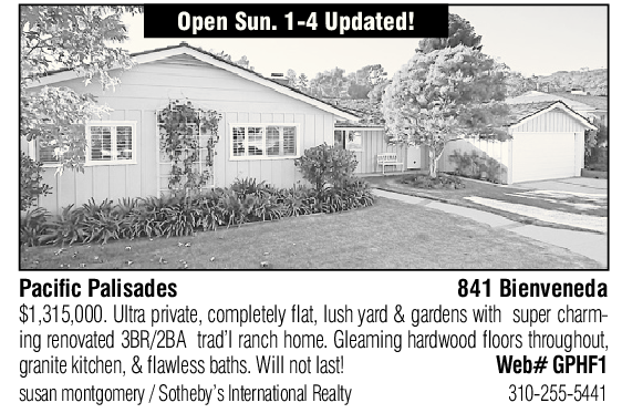 Open Sun. 1-4 Updated! Pacific Palisades 841 Bienveneda $1,315,000. Ultra private, completely flat, lush yard & gardens with super charming renovated 3BR/2BA trad’l ranch home. Gleaming hardwood floors throughout, granite kitchen, & flawless baths. Will not last! Web# GPHF1 susan montgomery / Sotheby’s International Realty 310-255-5441