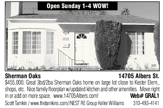 Sherman Oaks 14705 Albers St. $455,000. Great 3bd/2ba Sherman Oaks home on large lot close to Kester Elem., shops, etc. Nice family floorplan w/updated kitchen and other amenities. Move right in or add on more space. www.14705Albers.com! Web# GRAL1 Scott Tamkin / www.thetamkins.com//NEST RE Group Keller Williams 310-493-4141