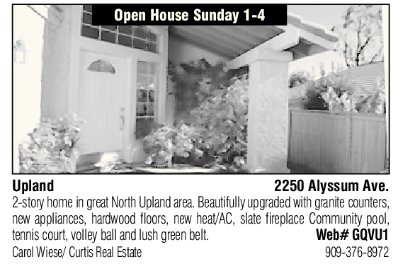 Open House Sunday 1-4 Upland 2250 Alyssum Ave. 2-story home in great North Upland area. Beautifully upgraded with granite counters, new appliances, hardwood floors, new heat/AC, slate fireplace Community pool, tennis court, volley ball and lush green belt. Web# GQVU1 Carol Wiese/ Curtis Real Estate 909-376-8972