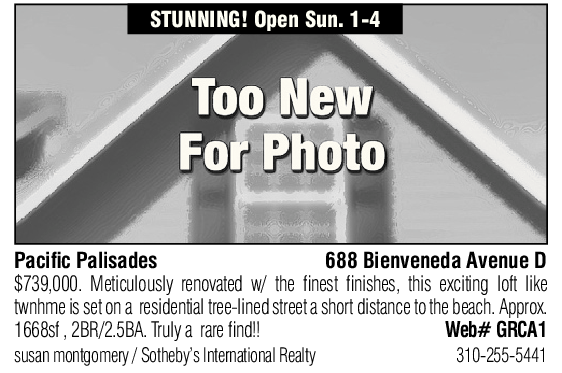 Pacific Palisades 688 Bienveneda Avenue D twnhme is set on a residential tree-lined street a short distance to the beach. Approx. $739,000. Meticulously renovated w/ the finest finishes, this exciting loft like 1668sf , 2BR/2.5BA. Truly a rare find!! Web# GRCA1 susan montgomery / Sotheby’s International Realty 310-255-5441