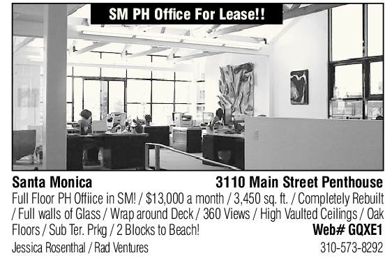 SM PH Office For Lease!! Santa Monica 3110 Main Street Penthouse Full Floor PH Offiice in SM! / $13,000 a month / 3,450 sq. ft. / Completely Rebuilt / Full walls of Glass / Wrap around Deck / 360 Views / High Vaulted Ceilings / Oak Floors / Sub Ter. Prkg / 2 Blocks to Beach! Web# GQXE1 Jessica Rosenthal / Rad Ventures 310-573-8292