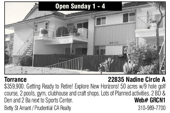 Open Sunday 1 - 4 Torrance 22835 Nadine Circle A $359,900. Getting Ready to Retire! Explore New Horizons! 50 acres w/9 hole golf course, 2 pools, gym, clubhouse and craft shops. Lots of Planned activities. 2 BD & Den and 2 Ba next to Sports Center. Web# GRCN1 Betty St Amant / Prudential CA Realty 310-989-7700 See also