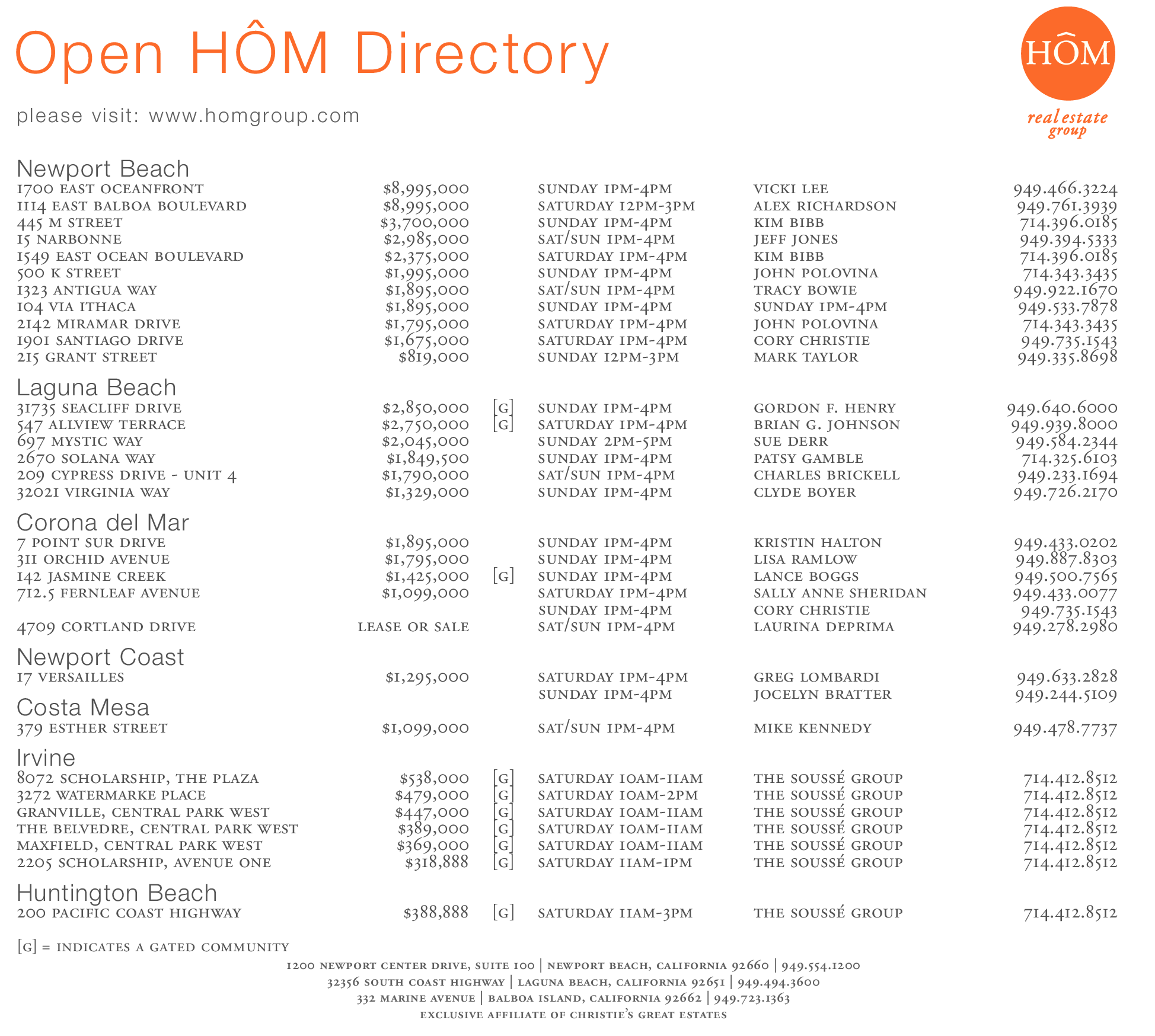 7 point sur drive $1,895,000 sunday 1pm-4pm kristin halton 949.433.0202 311 orchid avenue $1,795,000 sunday 1pm-4pm lisa ramlow 949.887.8303 142 jasmine creek $1,425,000 [g] sunday 1pm-4pm lance boggs 949.500.7565 712.5 fernleaf avenue $1,099,000 saturday 1pm-4pm sally anne sheridan 949.433.0077 sunday 1pm-4pm cory christie 949.735.1543 4709 cortland drive lease or sale sat/sun 1pm-4pm laurina deprima 949.278.2980