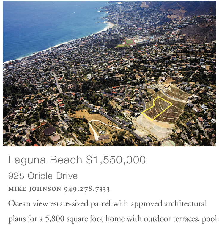 Laguna Beach $1,550,000 925 Oriole Drive mike johnson 949.278.7333 Ocean view estate-sized parcel with approved architectural plans for a 5,800 square foot home with outdoor terraces, pool.